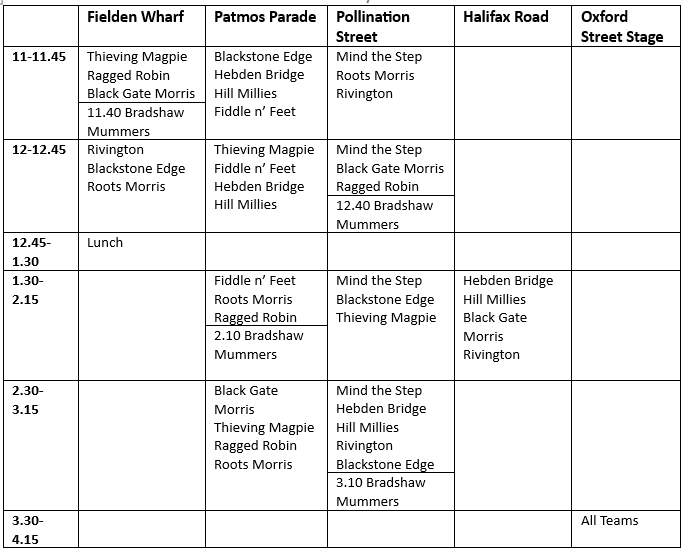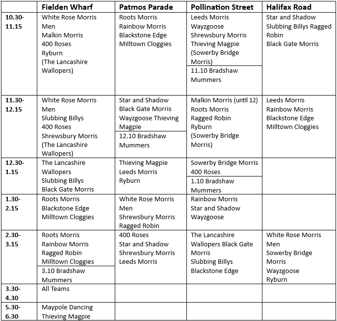 The team was originally formed as an all-male side in 1979 following the success of the Sowerby Bridge Rushbearing Festival. In 2011, the team was revived as a mixed side with a view to performing at that year’s Rushbearing. The team perform all four of their original dances from the early 1980s, as well as two traditional dances from the now sadly defunct Colne Royal Morris Men. They have also developed two original dances, the Jubilee Diamond and the Rushcart 8Dance.